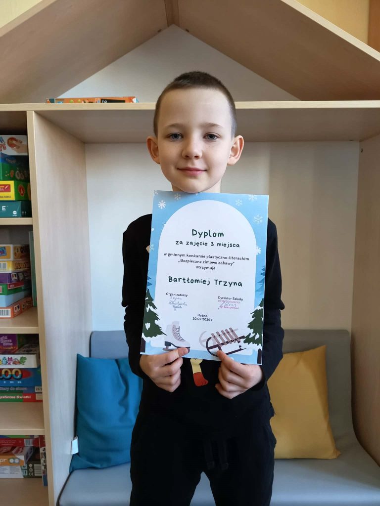 Uczeń naszej szkoły zajął III miejsce w gminnym konkursie „Bezpieczne zimowe zabawy”. To wspaniałe osiągnięcie i dowód na jego zaangażowanie oraz kreatywność. Serdecznie gratulujemy Bartkowi i życzymy mu dalszych sukcesów w kolejnych konkursach. Jesteśmy dumni z jego pracy i postawy. Jednocześnie zachęcamy innych uczniów do udziału w konkursach i rozwijania swoich talentów. Każdy udział to szansa na zdobycie nowych doświadczeń i sukcesów.